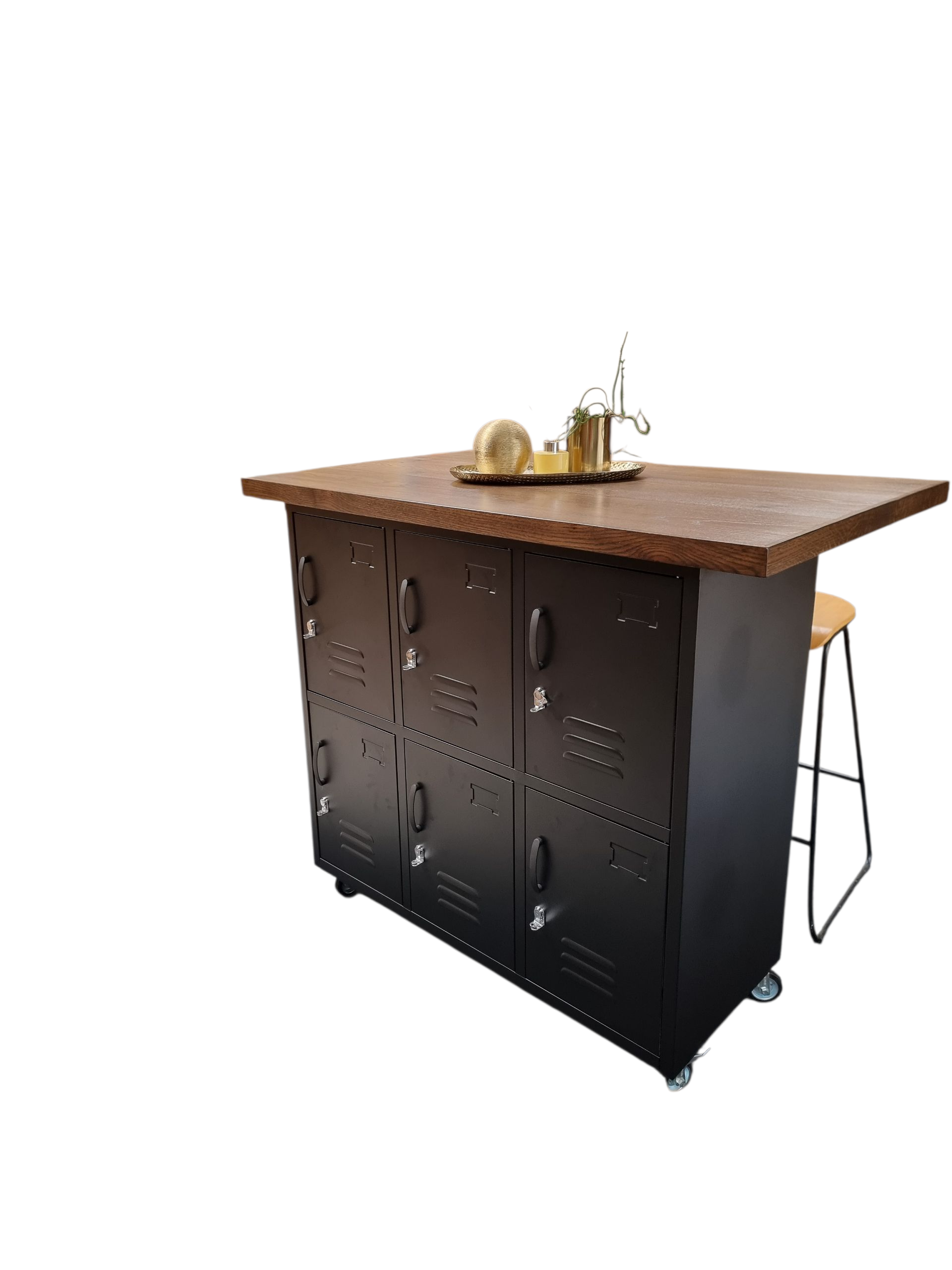 Gorgeous Dark Oak Island style top with the storage of 6 door locker on casters.