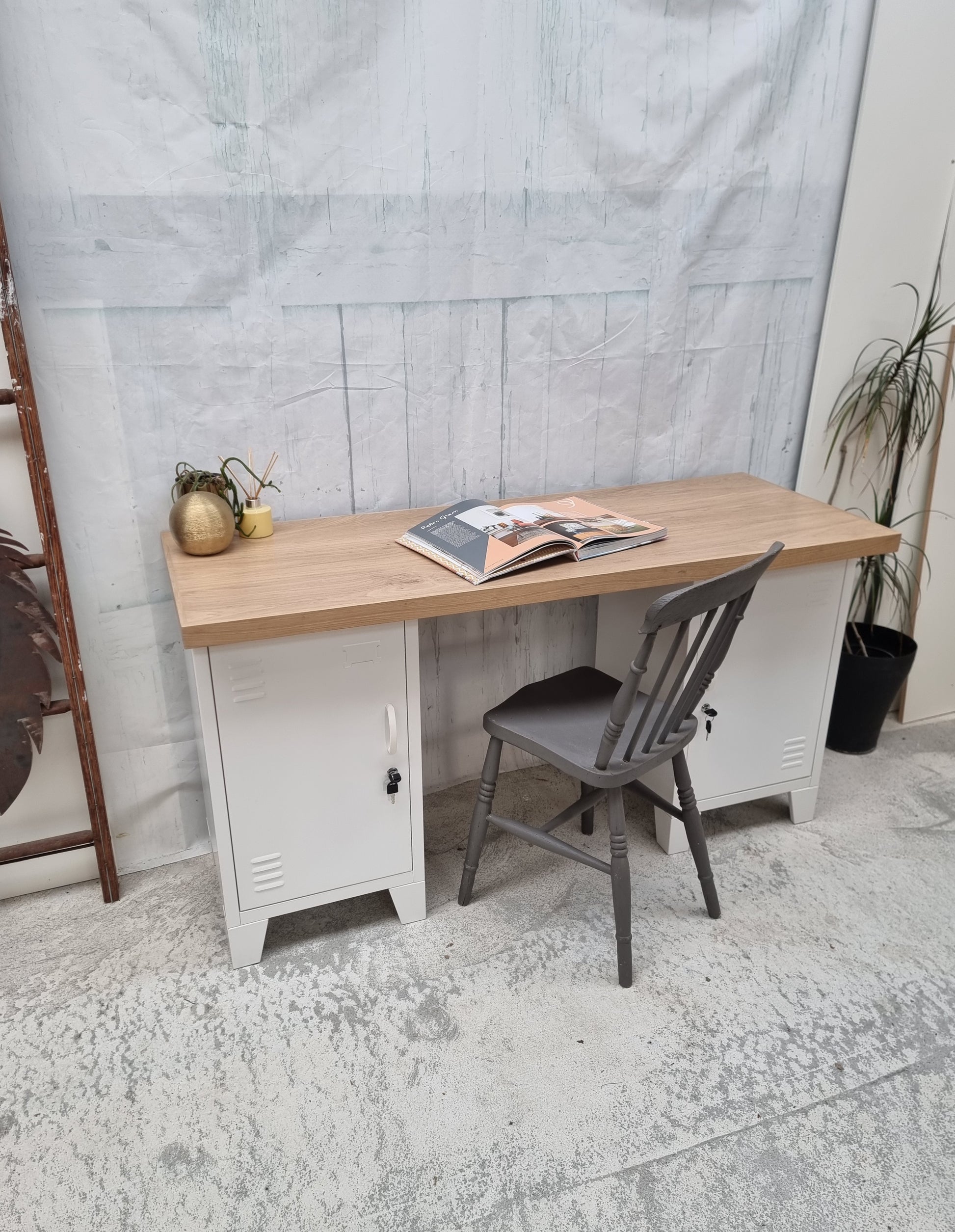 Upgrade your workspace with this stylish industrial desk featuring lockable white metal mini lockers on each side for secure and practical storage.